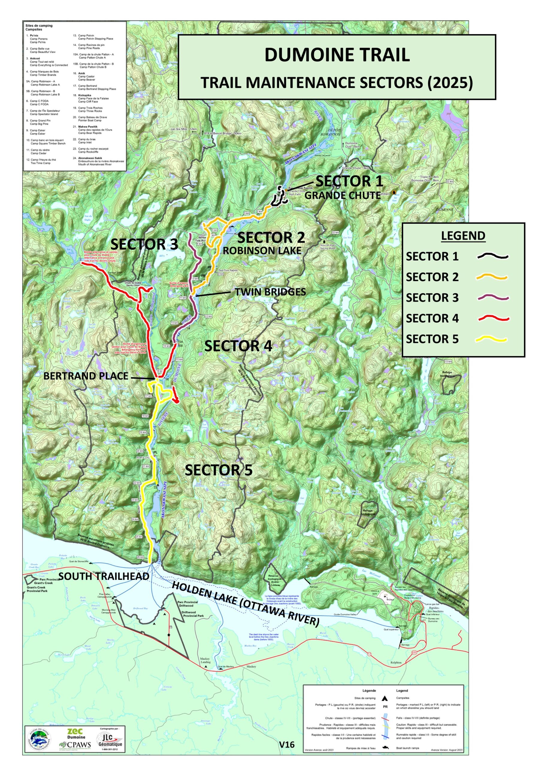 Les équipes de sentiers s’occupent des cinq secteurs du sentier. En 2024, un plan d’urgence a été élaboré en collaboration avec SAR North Renfrew, la Zec Dumoine, la MRC Pontiac et Air Medic, qui pourraient tous être impliqués dans un sauvetage.