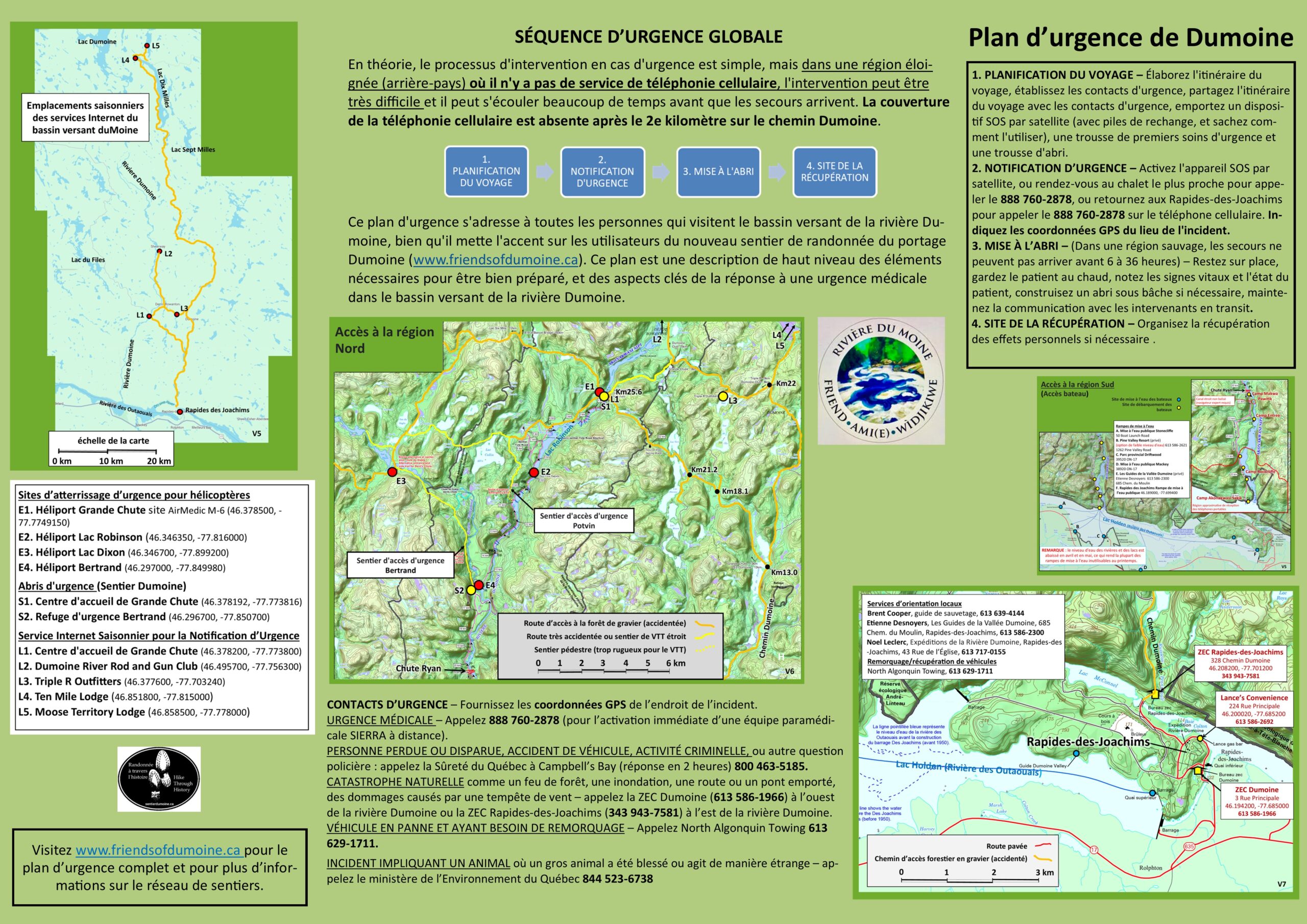 Les Amis de la Dumoine entretiennent les campings et les portages le long de ces itinéraires en coordonnant avec les excursionnistes en canot qui se portent volontaires pour nettoyer les campings, installer des toilettes extérieures (boîtes à tonnerre) et fournir des renseignements sur les conditions de la rivière. Les Amis de la Dumoine n’exigent pas de frais pour ces services.